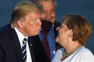 US President Donald Trump kisses Germany’s Chancellor Angela Merkel as G7 leaders and guests gather for a family picture in front of the Biarritz lighthouse on the second day of the annual G7 summit in Biarritz, France.